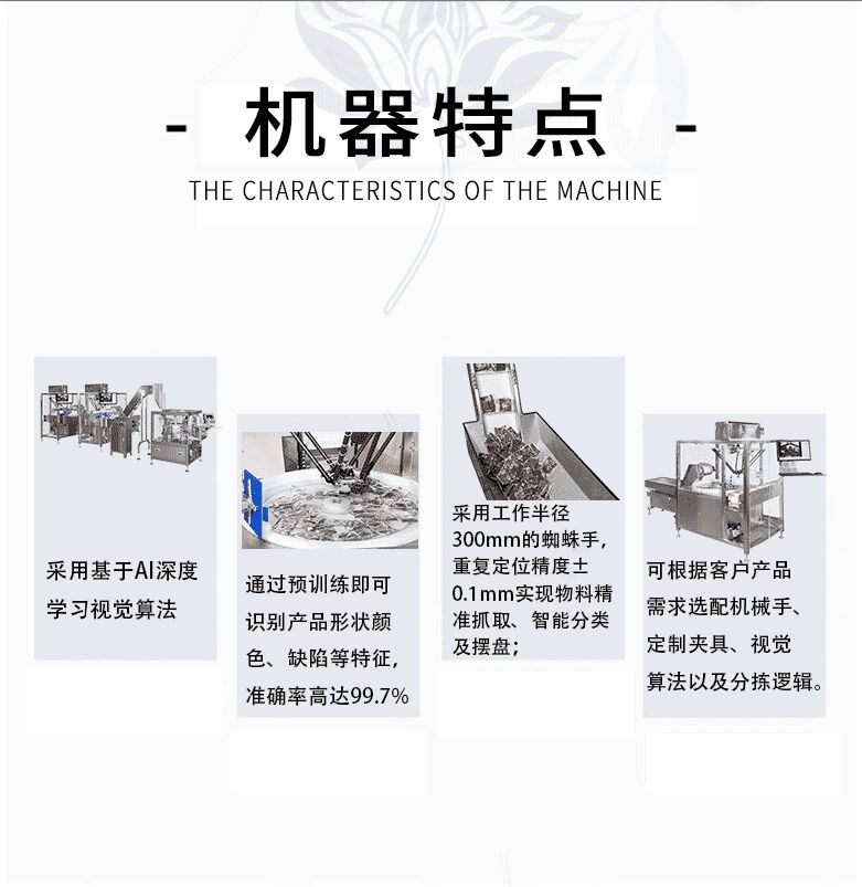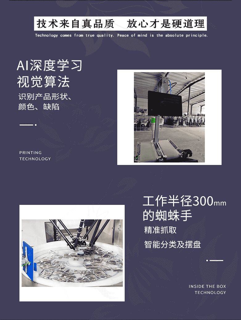 1、采用基于AI深度学习视觉算法,通过预训练即可识别产品形状、颜色、缺陷等特征,准确率高达99.7%; 2、采用工作半径300mm的蜘蛛手,重复定位精度±0.1mm,实现物料精准抓取、智能分类及摆盘; 3、可根据客户产品需求选配机械手、定制夹具、视觉算法以及分拣逻辑。